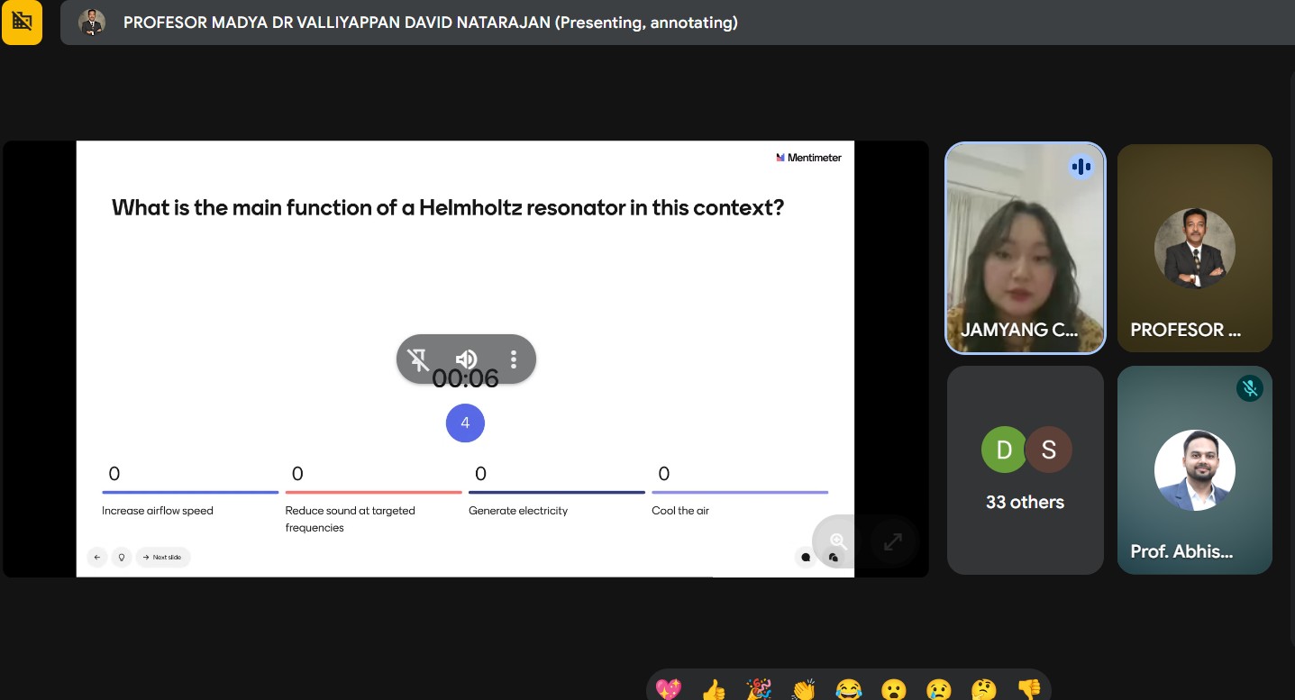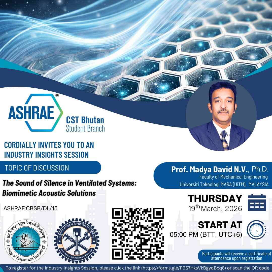 The ASHRAE–CST Bhutan Student Branch successfully organized an Industry Insights Session titled “The Sound of Silence in Ventilated Systems: Biomimetic Acoustic Solutions” on 19 March 2026, bringing together students, faculty members, and international experts to explore emerging developments in ventilation acoustics and sustainable building systems engineering.