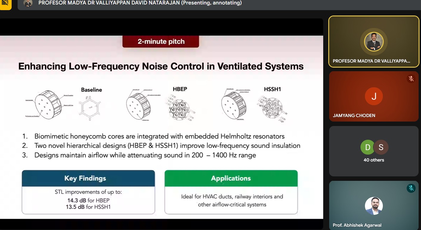 The lecture addressed a critical challenge in modern HVAC and building services engineering: achieving effective noise control in ventilated systems without compromising airflow performance. Drawing inspiration from biomimetic design principles, the session demonstrated how nature-inspired honeycomb acoustic structures can simultaneously support ventilation and enhance low-frequency sound insulation, an area where conventional acoustic panels often face limitations.
